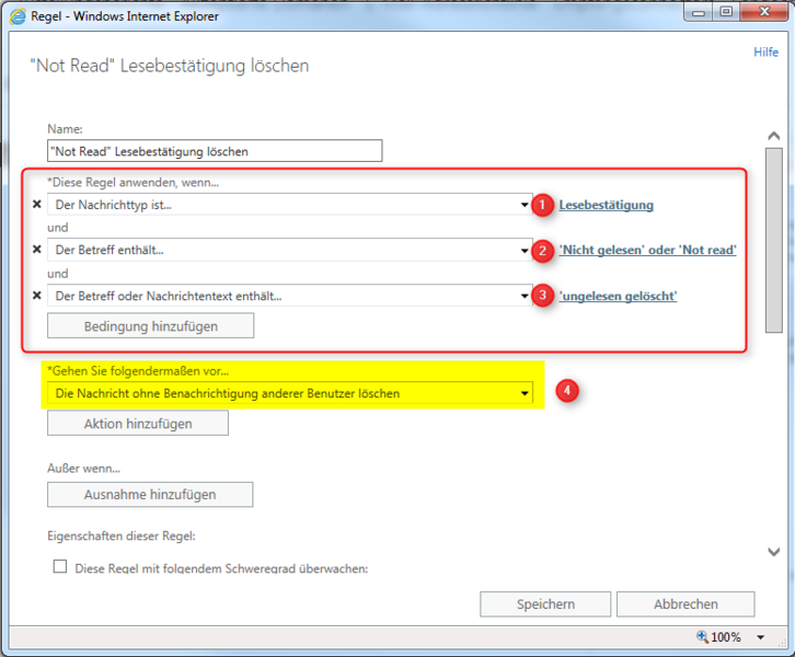 So, jetzt noch eine Aktion definieren, siehe (4). "Nachricht ohne Benachrichtigung anderer Benutzer löschen", ist aus meiner Sicht ideal. Das war's. Ab sofort werden die Benachrichtigungen kommentarlos gelöscht.