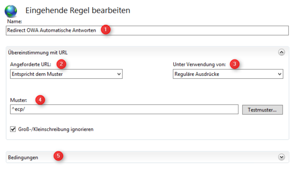 4. Hier wird das Muster für den URL-Pfad festgelegt. Das Symbol "^" definiert den Anfang des Musters, "ecp/" muss somit unmittelbar nach dem Host folgen. myserver/ecp/ trifft zu; myserver/abc/ecp dagegen nicht.
