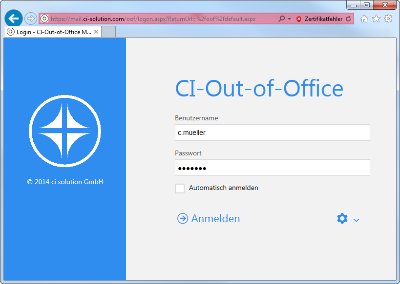 Rufen Sie jetzt die Funktion "Automatische Antworten" aus OWA auf. Wenn Sie alles richtig gemacht haben, werden Sie wie von Zauberhand auf das CI-Out-of-Office Web-Interface weitergeleitet...