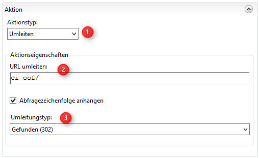 1. Aktionstyp ist "umleiten", denn der Anwender soll auf diese neue URL umgeleitet werden.