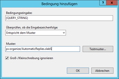 Unter Muster geben wir den Teil des Query-String an, der den URL eindeutig identifiziert. "$" markiert dabei das Ende des Query-String, d.h. dieser muss mit "p=organize/AutomaticReplies.slab" enden.