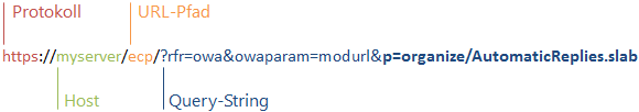 Ermitteln Sie zunächst den Ziel-URL der Funktion "Automatische Antworten" von OWA. Rufen Sie die Funktion dazu auf und kopieren Sie den URL. Im Fall von Exchange 2013 hat dieser den nachfolgend dargestellten Aufbau – Abweichungen sind möglich, das Prinzip bleibt aber das gleiche.