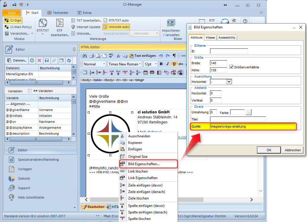3. Prüfen Sie die Bildquelle der Grafik im CI-Manager. Diese sollte immer relativ angegeben sein: images/ci-logo-small.png ist richtig, file:///D:/ci-sign_aktuell/ci-sign/Images/ci-logo-small.png dagegen falsch.