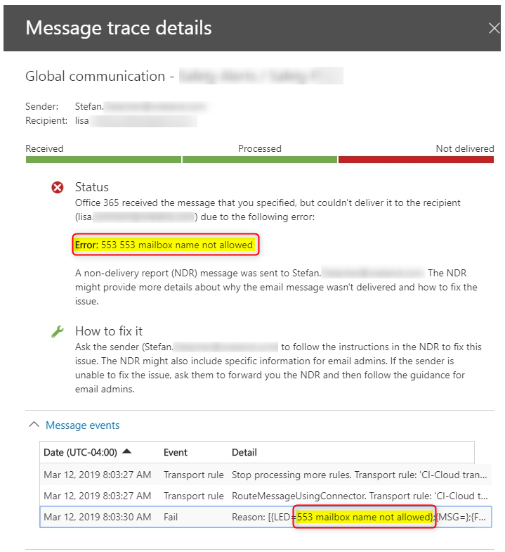 Reason: [{LED=553 mailbox name not allowed};{MSG=};{FQDN=cicloud.xxx.cloudapp.azure.com};{IP=52.169.xx.xx};{LRT=3/12/2019 12:03:27 PM}]. OutboundProxyTargetIP: 52.169.xx.xx. OutboundProxyTargetHostName: ci-cloud.xxx.cloudapp.azure.com