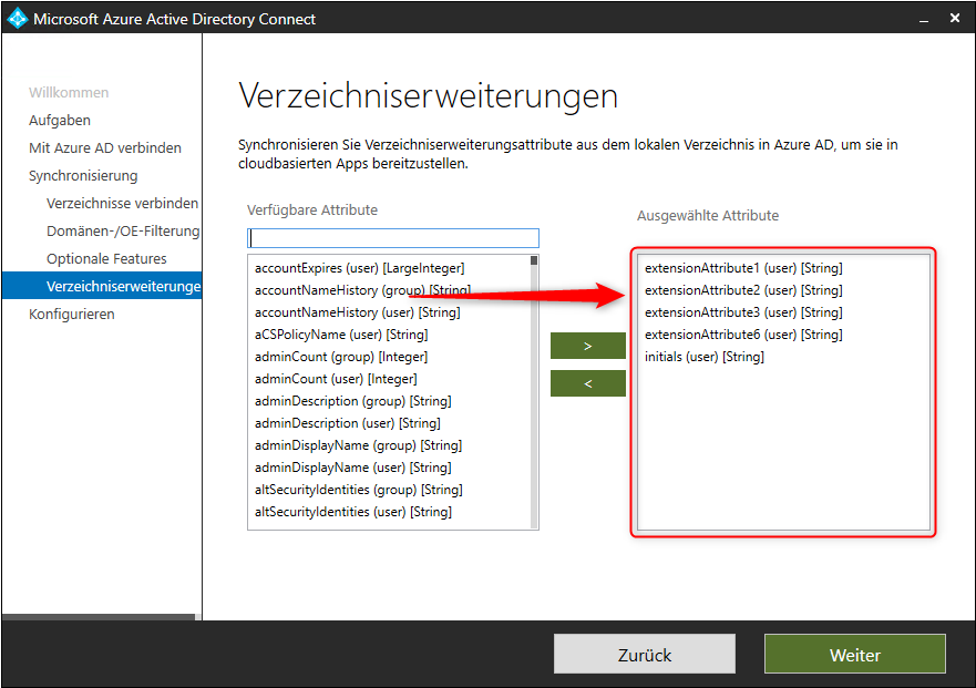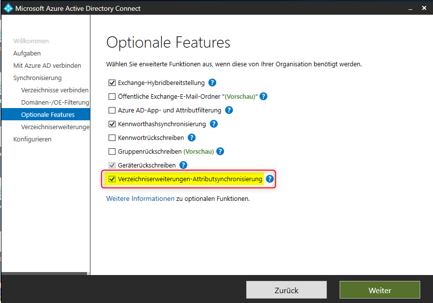Setzen Sie einen Haken bei „Verzeichniserweiterungen-Attributsynchronisierung“.