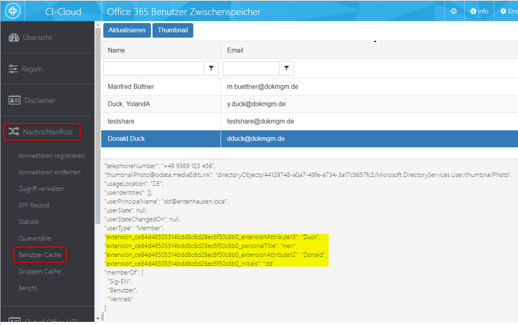 Den Erfolg dieser Aktion können Sie über das CI-Cloud Portal überprüfen. Unter Nachrichtenfluss -> Benutzer Cache sehen Sie die Rohdaten, so wie es Azure AD Graph zur Verfügung stellt. Die hinzugefügten Attribute beginnen mit „extension_“